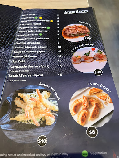 Start your meal with the perfect appetizers: the comforting Miso Soup, crisp Edamame, or the savory Gyoza (6 pieces) for a satisfying crunch. If you're craving something with a little kick, the Spicy Garlic Edamame or Takoyaki (6 pieces) will surely hit the spot.